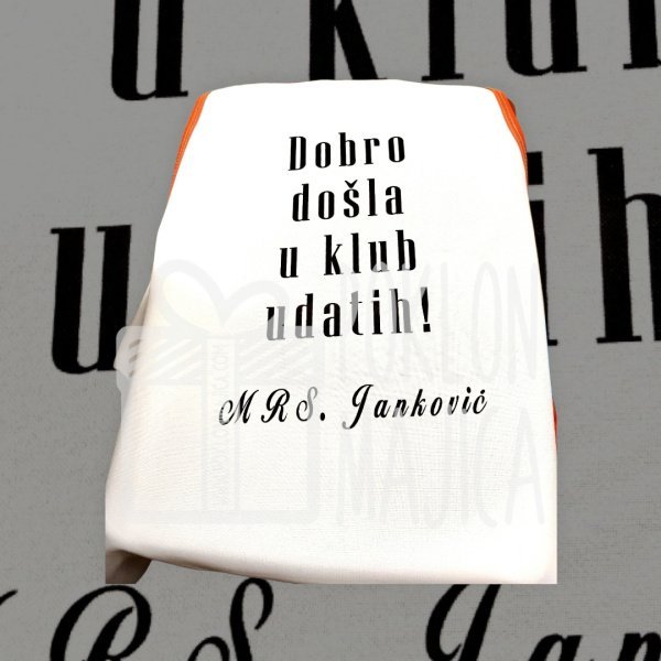 Kecelja sa natpisom za tek udatu ženu 🙂 (prezime po želji)