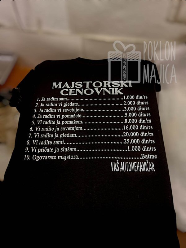 Majisa sa šaljivim natpisom – Majstorski cenovnik (crno bela)