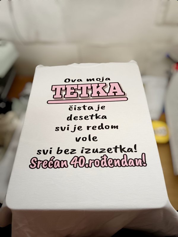 Majica sa ročendanskim motivom i smešnim tekstom. Odličan izbor za veselu atmosferu na zabavi.Tetki za 40ti ročendan 🙂