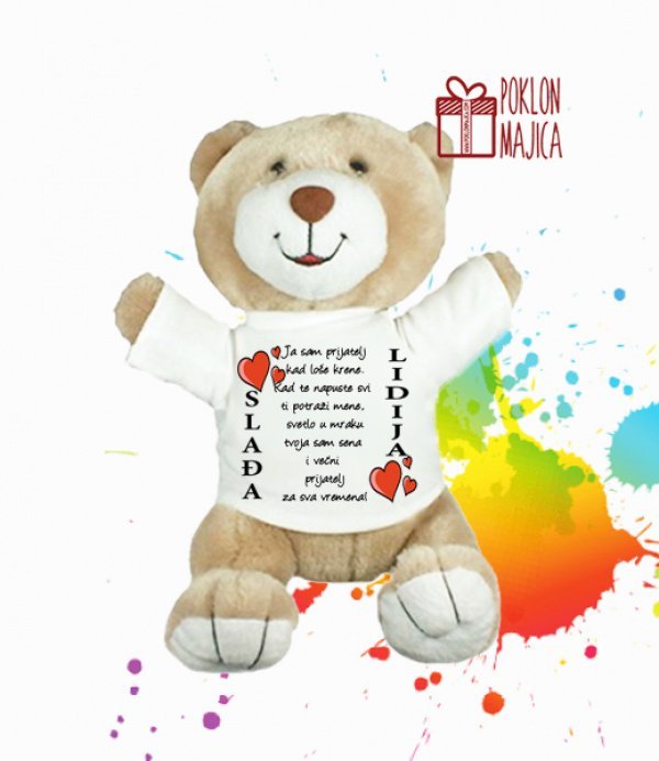 Tražite način da nekome kažete „Volim te“, „Srećan rođendan“ ili „Nedostaješ mi“ na najmekši mogući način? Naš plišani meda sa personalizovanom majicom je savršen ambasador vaših emocija. Ovaj klasični simbol nežnosti sada dolazi sa vašim ličnim pečatom.